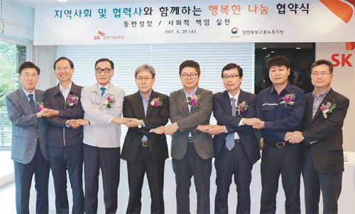 이 위원장은 “보이지 않는 곳에서 회사의 성장을 견인해 준 협력사는 한 가족이나 다름없다”며 “대기업과 중소기업의 동반성장이 사회적 화두인데 구성원들이 자발적으로 협약에 동참해 줘 고맙다”고 말했다. 협력사 대표로 참석한 송달순 메인테크 사장은 “협력사를 동반성장의 파트너로 인정하고 상생하려는 SK인천석유화학 임직원에게 깊이 감사드린다”며 “직원들의 처우 개선을 위해 자체적으로 더욱 노력하겠다”고 다짐했다.