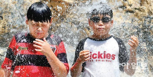 27일 부산 동래구 온천천 인공폭포에서 어린이들이 물을 맞으며 더위를 식히고 있다.