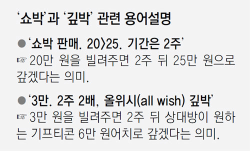 온라인 커뮤니티를 중심으로 신종 고리대인 ‘쇼박’과 ‘깊박’이 성행하고 있다. ‘쇼핑몰 박스’의 줄임말인 쇼박은 온라인으로 이뤄지는 고금리 대출. 깊박은 ‘기프티콘(모바일 선물쿠폰) 박스’를 줄인 말로, 돈을 빌린 뒤 50∼100% 이자를 붙여 기프티콘으로 갚는다. 중고품 거래 사이트와 10, 20대 커뮤니티엔 쇼박, 깊박을 판다는 글이 하루 10∼20건 이상 올라온다.