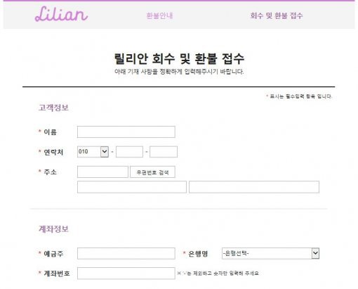 릴리안 생리대 환불은 홈페이지 ‘회수 및 환불 접수’ 페이지에서 할 수 있다. 환불을 원하는 구매자는 이름·연락처·주소 등 ‘고객정보’와 함께 예금주·은행명·계좌번호 등 ‘계좌정보’를 입력하면 된다. 아울러 ▲릴리안 생리대 구매처 ▲환불 제품정보 ▲반송정보를 입력한 뒤 ‘신청하기’를 누르면 환불 접수가 완료된다.