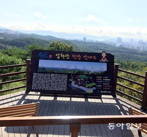 울산 시민들이 즐겨 찾는 도심 속 자연휴식처인 입화산(해발 204m). 울산 중구는 정상에 있던 산불감시초소를 2m 아래로 옮긴 뒤 그 자리에는 등산객들이 쉴 수 있게 팔각정 형태의 전망대를 설치했다. 전망대 주변으로는 목제 테라스와 벤치도 설치했다. 입화산 정상에서는 울산 전 시가지는 물론이고 현대자동차와 현대중공업 울산석유화학공단까지 내려다보일 정도로 전망이 좋은 데다 도심과 가까워 가족 단위 등산객들이 많이 찾는 곳이다. 하지만 최근 전망대 바로 앞에 ‘입화산 전망 안내도’가 설치됐다. 안내도에서는 입화산의 지명 유래와 등산지도, 그리고 전망대에서 보이는 곳을 사진과 함께 설명해주고 있다.