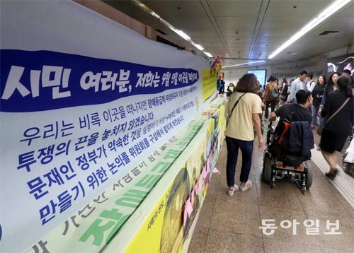 장애등급제와 부양의무제 폐지 등을 촉구하며 서울 광화문 지하보도에서 5년 동안 점거농성을 한 전국장애인차별철폐연대가 5일 농성장을 떠나고 있다. 이들은 지난달 25일 농성장을 찾은 박능후 보건복지부 장관이 “장애등급제 폐지 등을 논의하는 민관 협의체를 구성하겠다”고 약속한 뒤 농성을 끝내기로 결정했다.