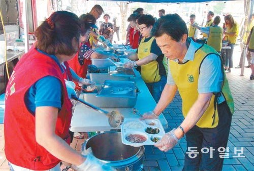 인천 남구 법사랑위원회 지회 회원 20여 명이 6일 경인전철 주안역 앞에서 무료 점심 봉사활동을 펼치고 있다. 이들은 쌀나눔운동본부에 성금과 식자재를 기부해 매달 첫째, 넷째 수요일 급식봉사를 한다.