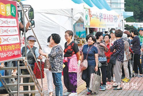 18일 부산 남구청광장에서 열린 ‘상주 농축산물 직거래 장터’에서 시민들이 상주 한우를 사기 위해 줄을 서 있다. 추석을 앞두고 상주축협 등 13개 단체가 육류, 과일류, 채소류, 가공품류 등 50여 개 품목을 19일까지 판매하고 있다.