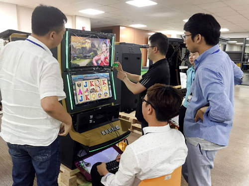 강원랜드 직원들이 자체 개발한 슬롯머신 시제품의 성능을 점검하고 있다. 강원랜드는 인증 절차가 마무리 되는 대로 2종류, 총 20대의 슬롯머신을 카지노 영업장에 설치해 운영할 예정이다. 강원랜드 제공