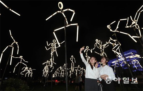 28일 서울 광화문광장을 찾은 시민들이 ‘서울거리예술축제 2017’의 공식 초청작품인 ‘키프레임’을 배경으로 사진을 찍고 있다. 키프레임은 조명기구로 만든 사람 모양의 캐릭터 80여 개가 다양한 장면을 선보이는 설치형 공연작품이다. 서울거리예술축제 2017은 다음 달 8일까지 열린다.