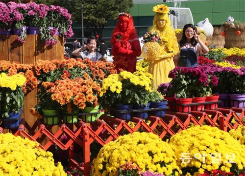 2일 ‘고양가을꽃축제’를 즐기려고 경기 고양시 호수공원을 찾은 한 가족이 온몸을 빨간색, 노란색으로 칠한 컬러마임 모델과 사진을 찍고 있다. 국화, 코키아 등 가을에 피는 꽃으로 가득한 축제는 9일까지 열린다.