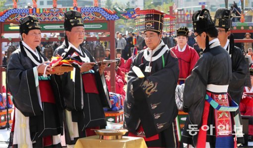 14일 서울 중구 서울광장에서 대한제국 선포 120주년을 기념해 고종 황제 즉위 및 대한제국 선포 과정을 재연한 행사가 처음으로 열렸다. 120년 전인 1897년 고종은 대한제국을 선포하며 외세 간섭에서 벗어난 제국의 출발을 알렸다. 고종 황제 역할은 증손자 이원 씨(앞줄 오른쪽에서 두 번째 곤룡포 입은 사람)가 맡았다.