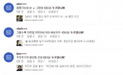 예를 들면 이런 식이다. 16일 서울 북한산에 첫 단풍이 시작됐다는 기사에는 “단풍놀이하러 내장산 놀러 가고 싶네요. 그런데 다스는 누구 겁니까(init****)”라는 댓글이, MBC 아나운서들이 신동호 국장을 고소했다는 기사에도 “에잇! 신동호. 그나저나 다스는 누구 겁니까?( tung****)”라는 댓글이 달렸다. 이뿐만 아니라 사건사고, 예능, 스포츠 등 기사 주제나 분야를 가리지 않고 ‘다스는 누구 겁니까?’라는 댓글이 우후죽순으로 달리고 있다.