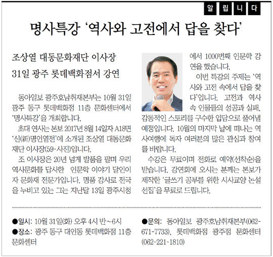 조상열 대동문화재단 이사장, 31일 광주 롯데백화점서 강연