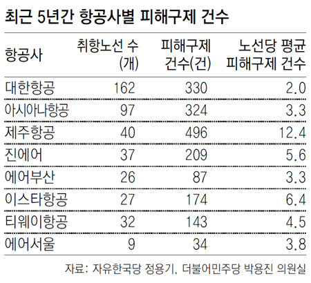 국내 저비용항공사(LCC) 급성장의 이면에서 무리한 취항 스케줄과 잦은 변동, 수하물 취급 등 세부 서비스 소홀로 인한 소비자 피해가 커지고 있다. 22일 더불어민주당 박용진 의원실이 소비자원으로부터 제출받은 자료에 따르면 제주항공은 최근 5년간(2013년∼올해 9월) 대형 항공사 2곳과 LCC 6곳을 포함한 전체 국적항공사 중 소비자 피해구제 건수 1위였다. 취항 노선 수 대비 소비자 피해구제 건수에서 LCC들은 대체로 대형 항공사들보다 높았다. 대한항공은 2.0, 아시아나는 3.3건인 반면 제주항공은 12.4건에 달했고, 이스타항공은 6.4건, 진에어는 5.6건, 티웨이항공은 4.5건이었다.
