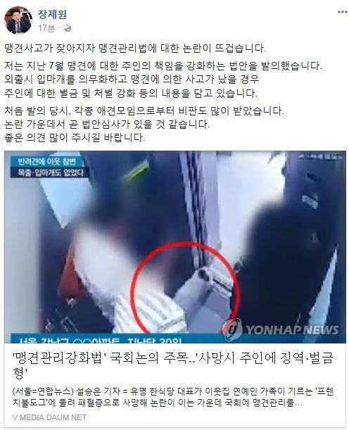 장제원 의원은 이날 자신의 소셜미디어에 “‘맹견관리강화법’ 국회 논의 주목…‘사망 시 주인에 징역·벌금형’”이라는 제목의 기사를 공유하면서 이같이 말했다.