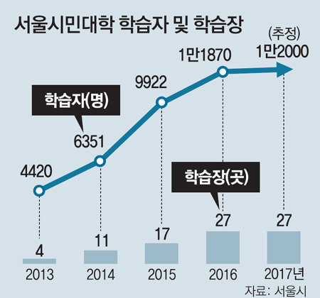 지금은 규모와 질 모두 달라졌다. 2013년 서울시가 ‘평생학습 추진계획’을 새로 마련하고 시민대학을 직접 운영하면서 현재 모습을 갖췄다. 지난해 학습자가 처음으로 1만 명을 넘어섰고, 올해는 약 1만2000명이 시민대학을 찾았다. 강좌는 270개로 역사 문화 철학 예술 과학 등을 망라한다. 학습장도 시민청과 뚝섬 은평 중랑학습장, 그리고 서울에 캠퍼스를 둔 23개 대학과 연계한 곳까지 모두 27곳이다.