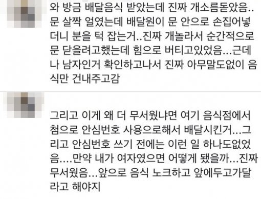 하지만 A 씨의 글만으로는 배달원이 불순한 의도가 있었는지, 아니면 단순히 음식을 건네주기 편하게게 문을 더 열려 했던건지 단정할 수 없는 상황이다.