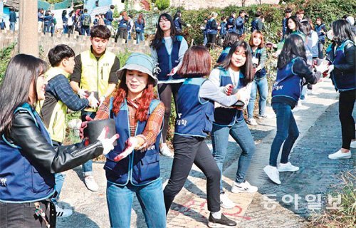 25일 오후 경남정보대 교직원과 총학생회 소속 학생들이 부산 사상구 괘법동에서 저소득가정에 연탄을 배달하고 있다. 이 대학 총학생회는 학술제에서 절약한 경비에 모금을 통해 모은 돈을 보태 연탄 2500장을 구입한 후 저소득가정 20가구에 전달했다.
