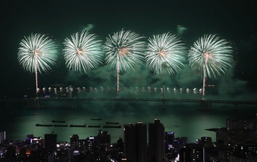 28일 저녁 부산 광안리해수욕장과 광안대교 일대에서 열린 2017 부산 불꽃축제에서 형형색색의 불꽃이 밤하늘을 수놓고 있다. 올해는 ‘10월의 어느 멋진 날에…’란 주제로 다양한 음악과 사랑을 테마로 한 감미로운 배경음악과 함께 드라마틱한 불꽃쇼가 펼쳐졌다.
