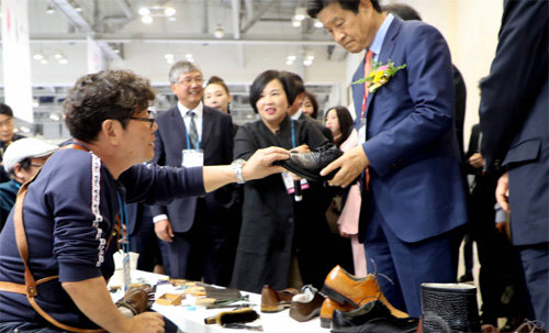 2일 부산 해운대구 벡스코 제1전시장에서 열린 ‘2017 부산국제신발패션섬유전시회’를 찾은 방문객들이 수제화 명장 1호 유홍식 씨(왼쪽 앉은 사람)의 신발 공방 부스를 둘러보고 있다. 17회째인 이번 전시회는 4일까지 열린다. 국내외 신발, 섬유, 패션업체 314개사가 참가했다.