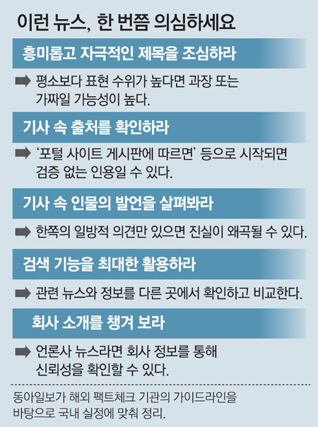 가짜 뉴스는 공인과 유명인뿐 아니라 일반인까지 ‘공격’ 대상으로 삼고 있다. 가짜인 줄 모른 채 믿었던 사람도 피해자인 건 마찬가지다. 그래서 뉴스 수용자가 어느 정도 검증 능력을 가질 필요가 있다. 국제팩트체크네트워크(IFCN)와 폴리티팩트(PolitiFact), 코렉티브(CORRECTIV) 등 각국의 팩트 체크 기관은 자국의 뉴스 수용자를 위해 가짜 뉴스 검증법을 제시하고 있다. 동아일보는 각 기관이 제시한 팩트 체크 가이드라인을 토대로 한국의 온라인 이용 실태에 맞춘 가짜 뉴스 검증 요령을 마련했다.