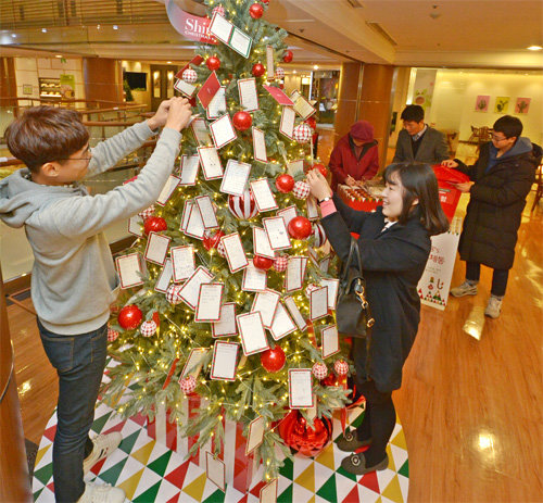 대구백화점 프라자점 11층을 찾은 고객들이 자신의 소망을 적은 카드를 트리에 달고 있다. 백화점 측은 다음 달 25일까지 100가지 사연을 선정해 상품권을 선물한다.