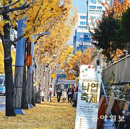 3일 부산 부산진구 전포동 놀이마루 앞길에서는 늦가을 정취를 느낄 수 있는 낙엽길 축제가 열리고 있다. 부산진구는 지역 내 다른 곳에서 발생한 낙엽도 공수해와 12월 한 달간 축제 구간을 은행나뭇잎으로 뒤덮을 계획이다.
