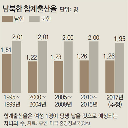 이처럼 남북한은 젊은 부부가 평생 자녀를 2명도 낳지 않는 ‘저출산의 덫’에 나란히 걸린 것으로 나타났다. 미국 중앙정보국(CIA)이 최근 발간한 ‘월드팩트북’에 따르면 한국의 올해 합계출산율(여성 1명이 평생 낳을 것으로 예상되는 자녀 수)은 1.26명으로 추산됐다. 조사 대상 224개국 중 219위다. 한국보다 출산율이 낮은 6곳 중 대만(1.13명)을 제외한 싱가포르(0.83명), 마카오(0.95명), 홍콩(1.1명), 푸에르토리코(1.22명) 등 5곳은 전부 인구가 1000만 명도 되지 않는 점을 감안하면, 한국이 사실상 전 세계 꼴찌나 다름없다. 미국 1.87명, 중국 1.6명, 일본 1.41명 등이었다.