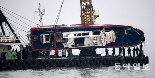 인양된 낚싯배 3일 오후 인천 옹진군 영흥도 남동쪽 1.9km 해상에서 급유선과 부딪혀 침몰한 낚싯배
