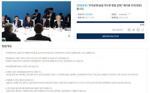 지난달 4일 청와대 홈페이지 국민청원 및 제안 게시판을 통해 제기된 ‘주취감형’ 폐지 청원 마감을 이틀 앞둔 지난 2일 참여자 수 20만 명을 넘으며 목표치를 달성했다.