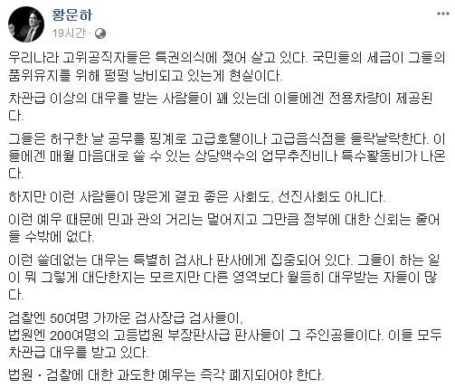 황 청장은 9일 페이스북에 올린 글에서 “차관급 이상의 대우를 받는 사람들이 꽤 있는데 이들에겐 전용차량이 제공된다”며 이같이 썼다. 그러면서 “그들은 허구한 날 공무를 핑계로 고급호텔이나 고급음식점을 들락날락한다. 이들에겐 매월 마음대로 쓸 수 있는 상당액수의 업무추진비나 특수 활동비가 나온다”고 지적했다.