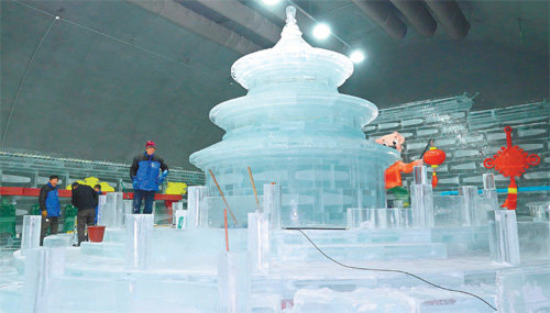 13일 강원 화천군 화천읍의 서화산광장에서 대형 얼음조각 작업이 한창이다. 일부 조각은 이미 완성이 임박한 듯 형체를 거의 다 갖추기도 했다. 이곳은 세계 최대의 실내 얼음조각광장으로 매년 중국인 기술자들을 초청해 대형 얼음조각을 만들어 전시한다. 이번에는 특히 2018 평창 겨울올림픽을 기념해 핀란드 헬싱키 대성당, 스위스 생모리츠 대성당 등 역대 겨울올림픽 개최국의 건축물 30여 점을 만든다.