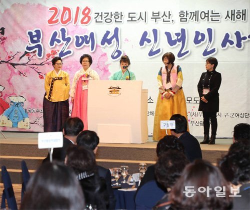 4일 부산 중구 코모도호텔에서 열린 부산여성 신년인사회에서 여성연대회의 이옥희 대표, 여성단체협의회 김위련 회장, 부산시군구여성단체협의회 김순례 회장, 여성NGO연합회 김영숙 상임대표, 여성단체연합 장선화 대표(왼쪽부터)가 단상에서 인사하고 있다.