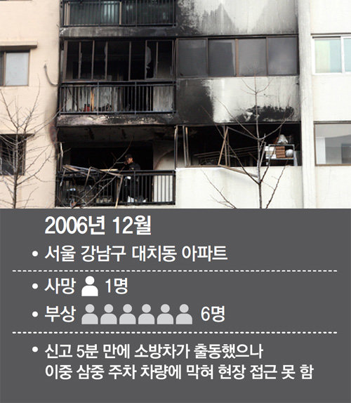 빼곡한 주차장 7일 서울 강남구 대치동의 한 아파트에 차량이 이중 삼중으로 주차가 돼 있다. 이 아파트는 2006년 12월 화재 당시에도 무분별한 주차로 소방차 진입이 20분 지연됐다. 홍진환 기자 jean@donga.com 2006년 12월 중순 A아파트에서 불이 났다. 소방차는 신고 5분 만에 아파트 입구에 도착했다. 그러나 좀처럼 화재 현장에 가까이 다가서지 못했다. 빼곡히 주차된 차량 탓이었다. 오전 4시 반에 일어난 불이라 운전자를 부르는 데 시간이 걸렸다. 차량을 밀면서 하나하나 옮기는 작업이 시작됐다. 20분 만에야 고가사다리차와 펌프차가 들어섰다. 하지만 화마(火魔)를 피해 베란다 난간에 매달렸던 50대 여성은 결국 숨졌다.