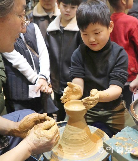 16일 부산 남구 부산박물관에서 열린 ‘겨울방학 무형문화재 체험행사’에 참가한 학생들이 인간문화재 김영길 사기장의 지도로 도자기그릇을 만들고 있다. 18일까지 열리는 이번 행사