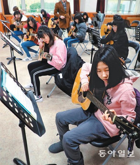 17일 부산 진구 부산학생문화회관 교양문화교실에서 학생들이 기타를 배우고 있다. 이 강좌는 겨울방학을 맞아 문화회관이 학생들의 문화 예술분야의 특기 및 적성을 개발해 주기 위해 개설했다.