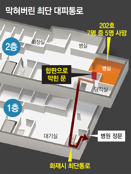 하지만 병원 측은 2012년경 202호 병실을 복도까지 넓히면서 보조계단으로 나가는 문을 합판으로 막아버렸다. 개조 후 이 계단은 2층 구석에 있는 당직실로만 연결됐다. 응급실 의료진만 아는 공간이 된 것이다. 병원 측은 일반 환자가 이 보조계단에 접근하는 것을 차단했다. 바로 붙어 있는 202호실 환자들마저 계단을 이용할 수 없었다. 이 병실 환자 7명 중 5명이 숨졌다. 202호실 생존자 A 씨는 “당직실과 병실 사이를 나무판자 여러 개로 가려놨는데 틈새로 당직 의사가 오가는 게 보일 만큼 허술했다”고 말했다.