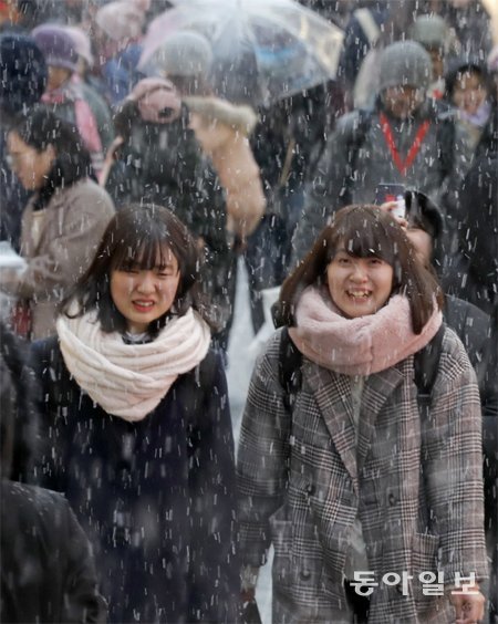30일 오후 함박눈이 내리는 서울 명동 거리를 시민들이 걸어가고 있다. 이날 서울과 경기, 강원 영서 일부 지역에 기습적으로 많은 눈이 내리면서 퇴근길 시민들이 큰 불편을 겪었다.