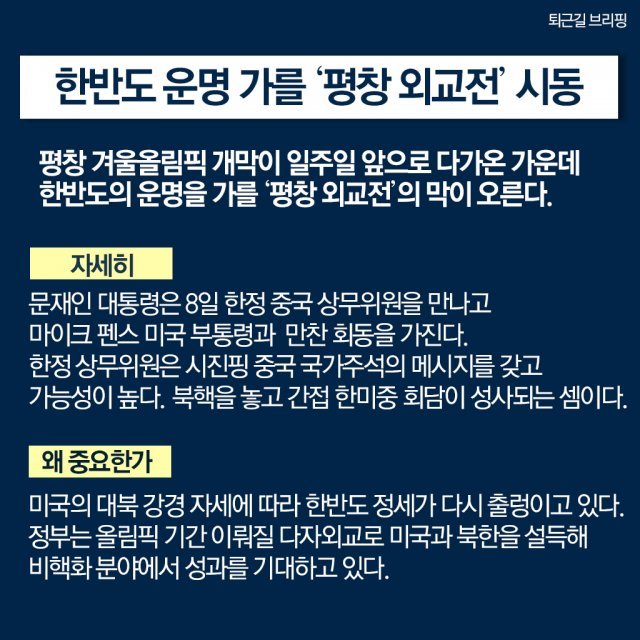 ·자세히: 문재인 대통령은 8일 한정 중국 상무위원을 만나고 마이크 펜스 미국 부통령과 만찬 회동을 가진다. 한정 상무위원은 시진핑 중국 국가주석의 메시지를 갖고 가능성이 높다. 북핵을 놓고 간접 한미중 회담이 성사되는 셈이다.