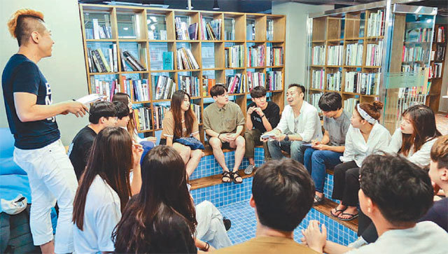 지난해 3월 동의대 근처에 문을 연 청년창조발전소 ‘디자인 스프링’. 목욕탕 건물을 사들여 다시 꾸민 창작 공간에서 청년들이 토론을 하고 있다. 부산시 제공