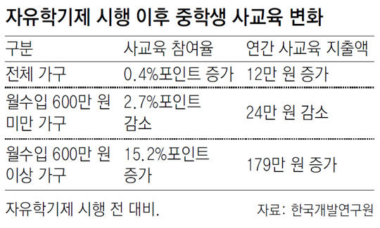 중학교에 자유학기제가 도입된 이후 고소득 가정의 사교육비 지출이 크게 늘고 있다는 분석이 나왔다. 창의적인 교육을 유도하려는 취지의 자유학기제가 오히려 소득계층 간의 학력 격차를 심화시킬 수 있다는 지적이 나온다.