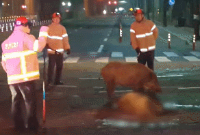 멧돼지 한 마리는 이미 차에 치여 죽은 상태였고, 나머지 한 마리는 죽은 돼지 곁을 떠나지 못하고 맴돌고 있었다. 구조대가 포획하기 위해 가까이 다가가도 멧돼지는 자리를 달아나지 않았다.