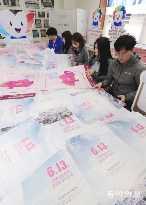 6·13 지방선거가 약 두 달 앞으로 다가온 가운데 11일 광주 서구 치평동 광주시선관위 사무실에서 선관위 직원들이 선거 참여를 알리는 홍보포스터 등 인쇄물을 분류하고 있다.