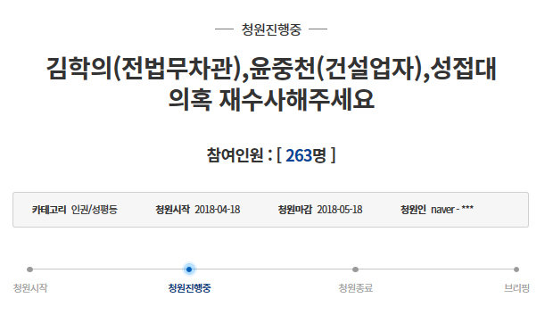청원인은 “‘PD 수첩’에서 보여준 (김학의·윤중천의) 행태는 정말 어처구니없다. 여성을 성폭행하고 동영상을 찍어 협박, 성노리개 삼고 (동영상을) 가족에게까지 전달하여 가정을 파괴하는 일에 우리나라 고위 법무직 공무원이 함께 했다. 그것도 모자라 (검찰에서) 무혐의 처리했다는 사실은 결코 간과할 수 없다. 철저히 조사해 법과 질서가 위로부터 잘 지켜지는 사회가 되길 바란다”고 강조했다. 이 외에도 관련 청원이 다수다.