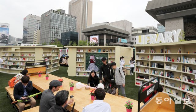 22일 서울 종로구 광화문광장 ‘누구나 책, 어디나 책’ 행사장에서 시민들이 책을 보며 담소하고 있다. 문화체육관광부와 책의해조직위원회가 개최한 이번 행사는 ‘세계 책과 저작권의 날’인 23일까지 열린다.