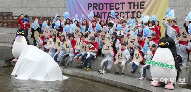 지구의 날인 22일 서울 청계천에서 국제환경단체 ‘그린피스’ 회원들이 남극 빙하 조형물을 앞에 두고 10월 남극해양생물자원보존위원회에서 남극해 일대의 해양보호구역 지정을 촉구하는 퍼포먼스를 펼치고 있다.