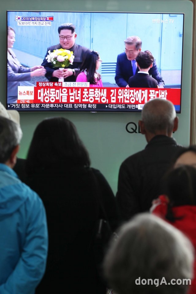 2018 남북 정상회담이 열린 27일 오전 서울역에서 시민들이 문재인 대통령이 군사분계선에서 김정은 북한 국무위원장을 맞이하는 모습을 TV를 통해 보고 있다.