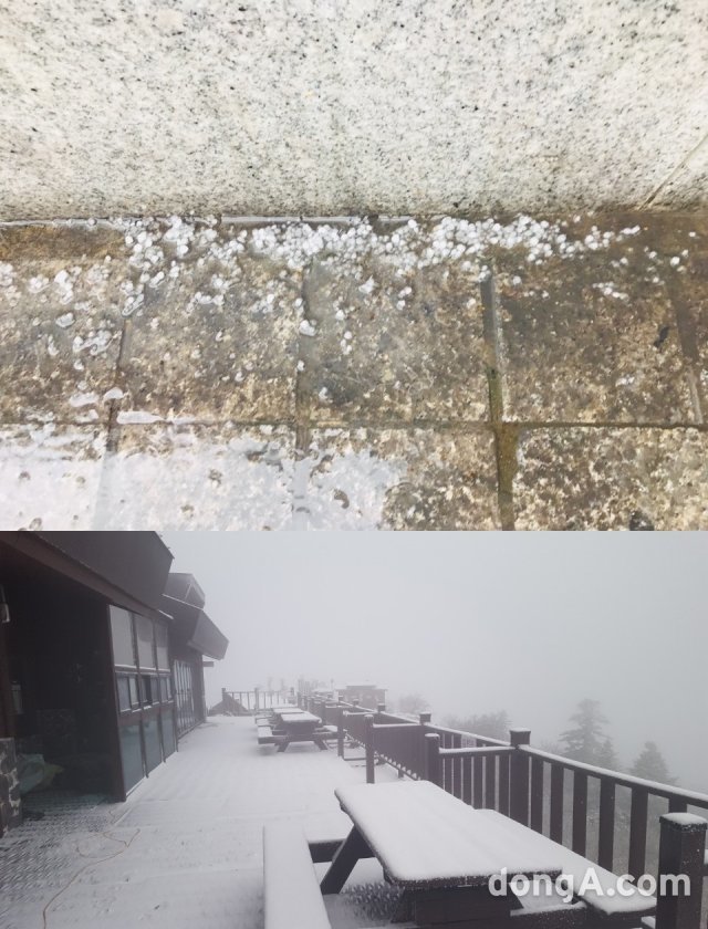 반면 강원도에서는 눈이 내렸다. 이날 새벽 설악산 고지대 기온이 영하로 떨어지며 설악산 중청대피소에 눈이 쌓였다.
