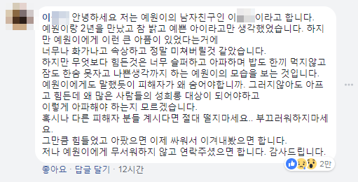 이에 양예원의 남자친구 이모 씨는 댓글에 "저는 예원이의 남자친구다. 예원이랑 2년을 만났고 참 밝고 예쁜 아이라고만 생각했었다. 하지만 예원이에게 이런 큰 아픔이 있었다는 거에 너무나 화가 나고 속상하고 정말 미쳐버릴 것 같다"라고 밝혔다.