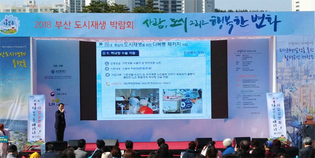 부산시는 부산만의 통합 복지 브랜드인 ‘다함께 행복한 동네(다복동)’ 만들기 사업의 효율적인 추진을 위해 다복동 패키지 사업을 새로 추진하고 있다. 3월 부산시민공원에서 열린 부산도시재생박람회의 다복동 패키지 사업 설명회 모습. 부산시 제공