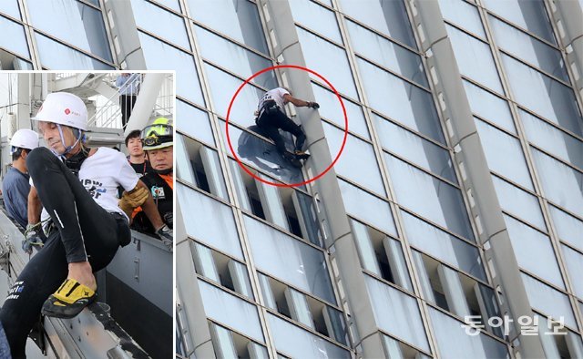 6일 오전 7시 50분경 국내 최고층(지상 123층·555m) 건물인 서울 송파구 롯데월드타워 근처에 외국인 세 명이 나타났다. 일행은 손에 레저스포츠용 카메라인 ‘고프로’와 고가의 디지털일안반사식(DSLR) 카메라 같은 촬영 장비를 들고 있었다. 수상한 낌새를 눈치 챈 건물 보안요원이 일행에게 다가갔다. 그러자 일행 중 한 명이 갑자기 자리를 옮겼다. 보안요원이 시선을 돌린 사이 옅은 금발의 중년 남성 한 명이 건물 벽에 가까이 다가섰다. 보안요원이 다시 시선을 돌렸을 때 남성은 이미 건물 2층 근처를 오르고 있었다.
