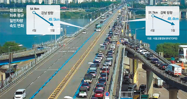 천호대교는 남북 각각 편도 3차로로 제한최고속도는 시속 60km다. 중앙차로 설치로 차로 수가 줄어들어 승용차 속도가 감소하는 건 당연하다. 하지만 천호대교는 감소 폭이 컸다. 서울교통정보센터(TOPIS) 집계 결과 지난달 하루 평균 천호대교 남북 방향의 승용차 통행 속도는 4월과 비교해 각각 10.1%, 7.1% 줄었다. 북쪽 방향은 퇴근시간인 오후 6∼7시에 22.1% 줄어 시속 26.7km에 그쳤다. 남쪽 방향도 오전 11시∼낮 12시 15.9% 줄었다.