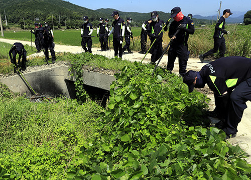 16일 전남 강진군에 아르바이트를 하러 간 여고생이 실종된 가운데 수색작업에 투입된 경찰이 강진군 도암면의 한 농수로 근처를 확인하고 있다. 이 근처에서 실종된 여고생의 휴대전화 신호가 마지막으로 포착됐다. 사진=박영철 기자 skyblue@donga.com